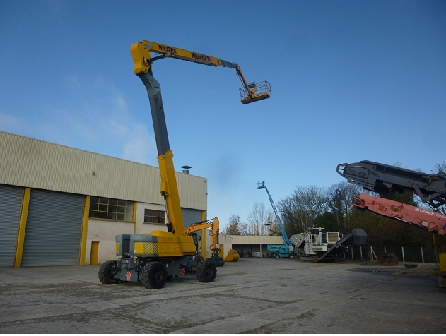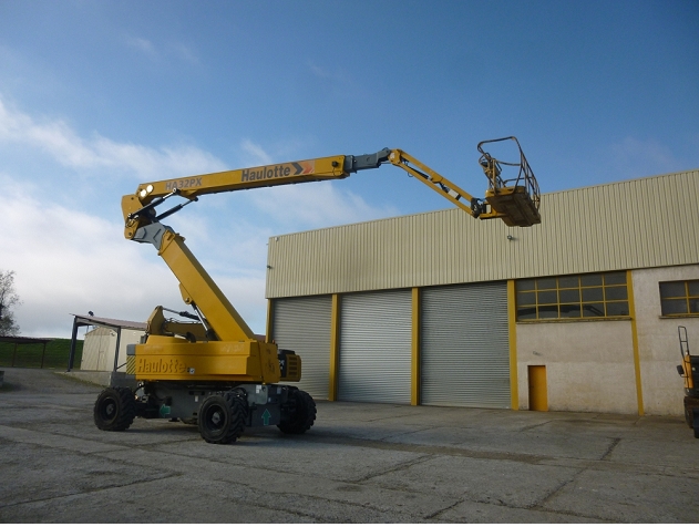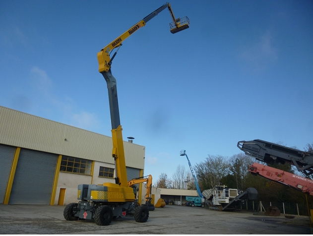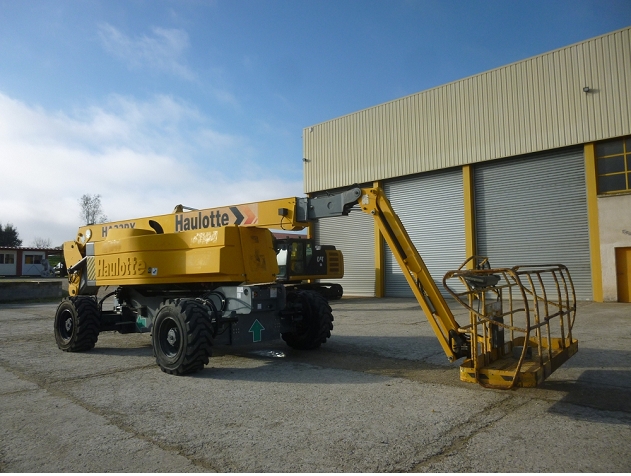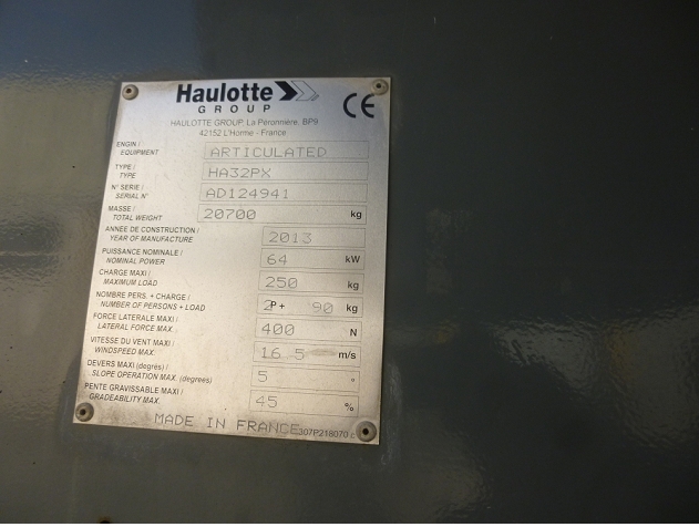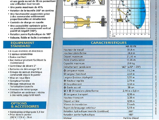 Hauteur de travail = 32m 4 roues motrices et directrices Pneus Outrigger 445/65/22.5 = usure 10% Copie certificat CE Dimensions de transport : L = 11,30m / l = 2,50m / H = 2,80m |